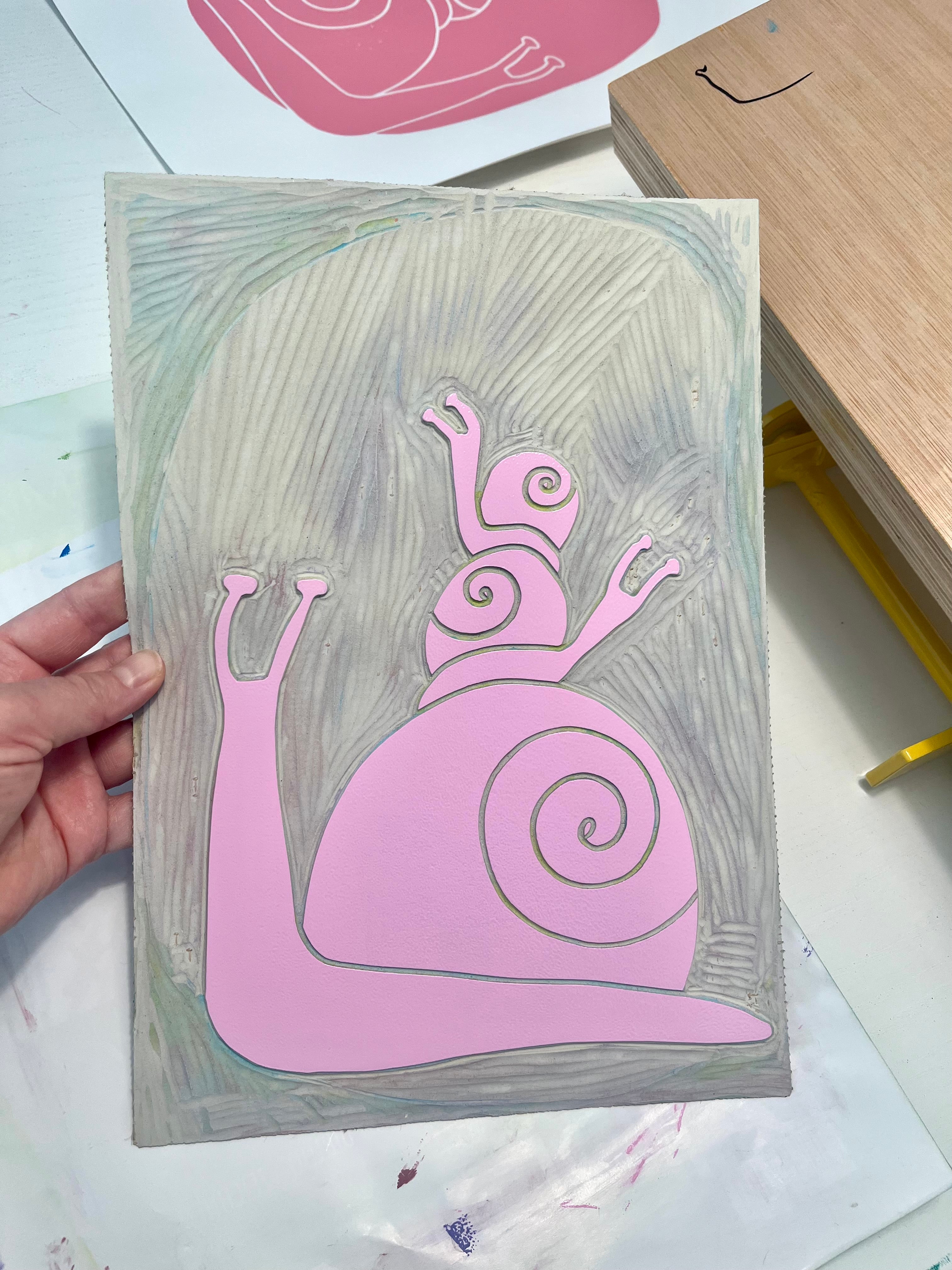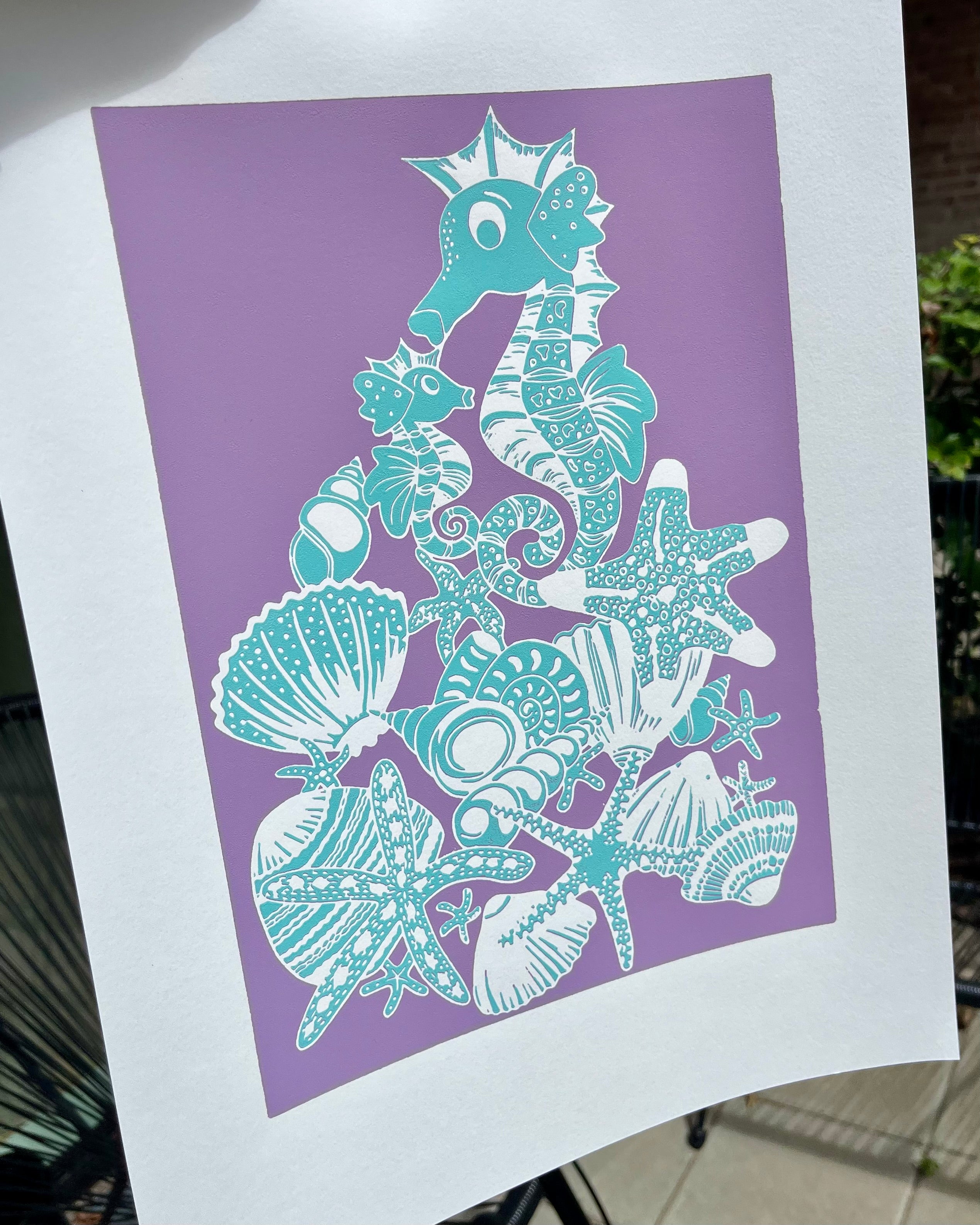 Linoleumstryk fra Linoprints for babies er alle håndtegnede, skåret i hånden og trykt med en håndholdt linoleumspresse på syrefrit papir, der forhindrer at papiret bliver gult og skrøbeligt over tid.